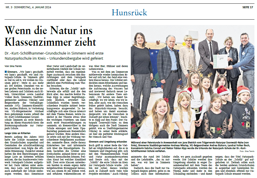 Kurz vor Weihnachten überreichte Landrat Volker Boch im Beisein von Andrea Etzkorn, der Beigeordneten der Verbandsgemeinde, Stadtbürgermeister Andreas Nikolay und Jane Dietrich vom Trägerverein Naturpark Soonwald-Nahe die Ernennungsurkunde zur Naturparkschule an den Schulleiter Fabian Kipp und die Konrektorin Sabrina Conrad im Rahmen eines Schulfestes zum Thema „Waldweihnacht“.