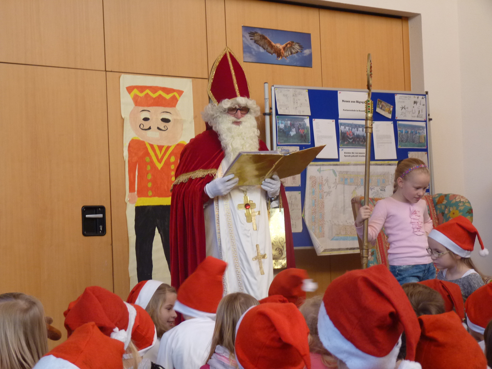 Im Rahmen einer kleinen Feierstunde besuchte am 7. Dezember der Nikolaus die 1. und 2. Klassen der Dr.-Kurt-Schöllhammer-Schule. Die Schüler und Schülerinnen hatten Lieder, ein Flötenspiel, Klanggeschichten und Gedichte eingeübt, die sie dem Nikolaus vortrugen. Sichtlich stolz durfte der ein oder andere auch den Stab des heiligen Nikolaus halten. Dann las der Nikolaus aus seinem goldenen Buch vor. Die Kinder, vor allem die kleinen, hingen ehrfürchtig an den Lippen des heiligen Mannes, der alles zu wissen schien. Zum Glück überwogen eindeutig die Lobesworte und so beschenkte Nikolaus alle Schüler und Schülerinnen zur Belohnung mit kleinen Leckereien. Auch die Schulkinder überreichten dem Nikolaus selbstgemalte Bilder und sangen zum Abschied fröhlich: „Danke, lieber Nikolaus! Komm bitte bald wieder in unser Haus!“